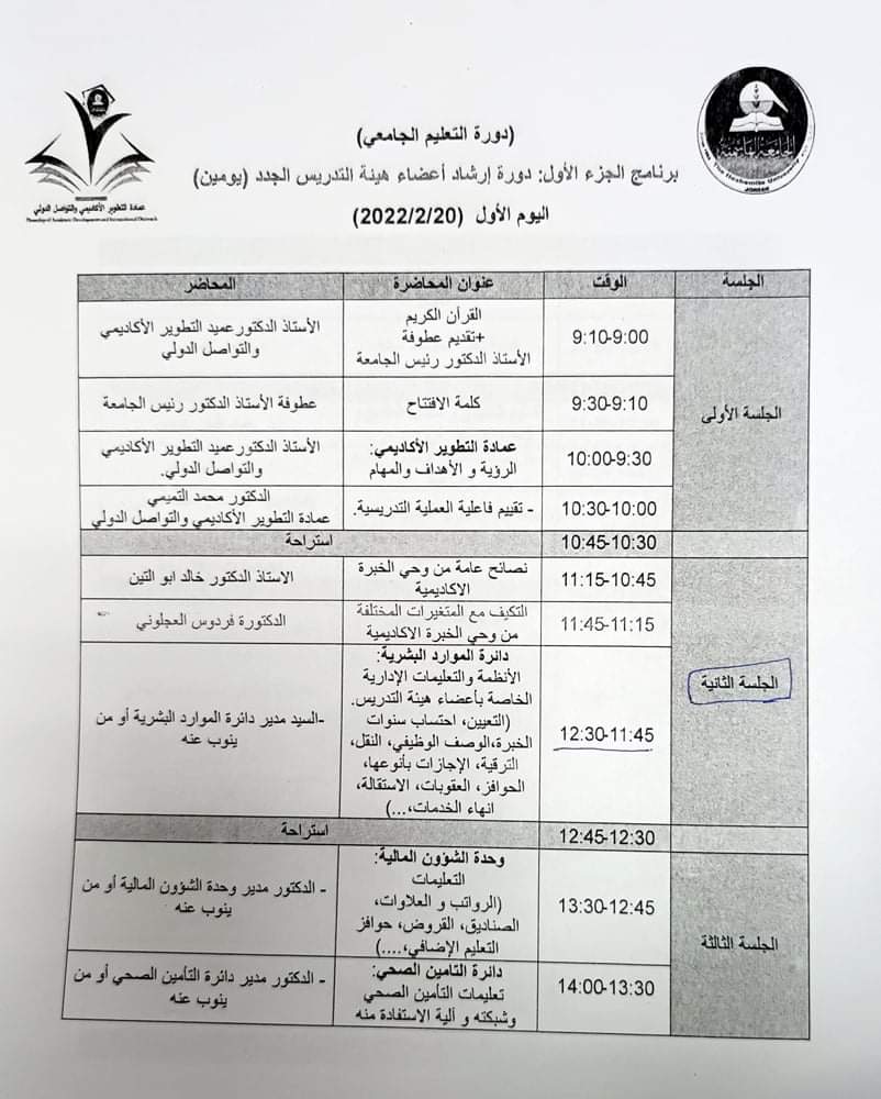 ويشارك في الدورة التي تستمر أربعة أيام، نحو (60) عضو هيئة تدريس جديد من مختلف الكليات والأقسام، وحضر حفل الافتتاح نائب رئيس الجامعة الأستاذ الدكتور سلطان المعاني، وعميد التطوير الأكاديمي الأستاذ الدكتور عدنان أبوصرة، وعميد كلية العلوم الأستاذ الدكتور خالد أبوالتين، وعميد شؤون الطلبة الأستاذ الدكتور صادق الشديفات، ومدير وحدة المكتبة الأستاذ الدكتور عمر الفجاوي.