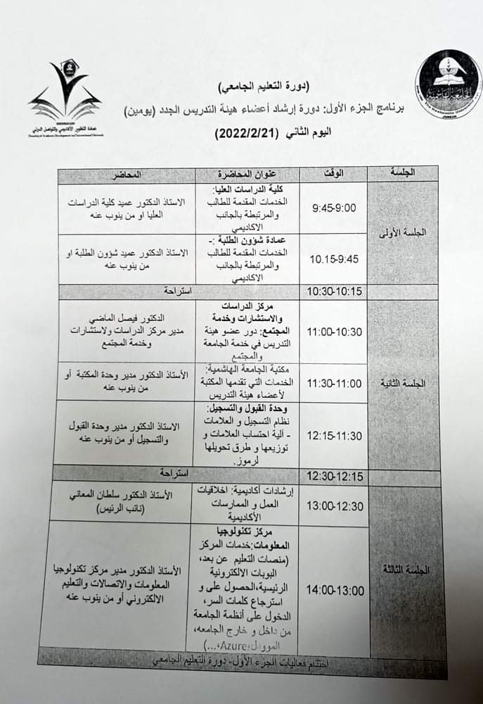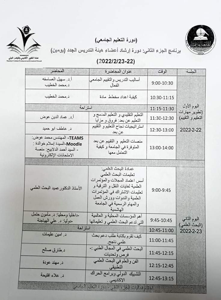 برعاية رئيس الجامعة الهاشمية...عمادة التطوير الأكاديمي والتواصل الدولي تفتتح دورة التعليم الجامعي للعام 2022