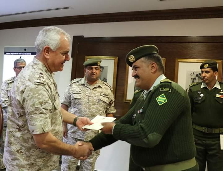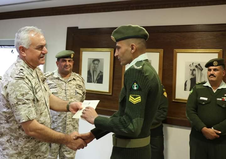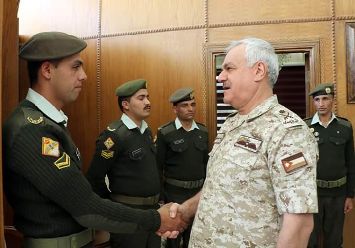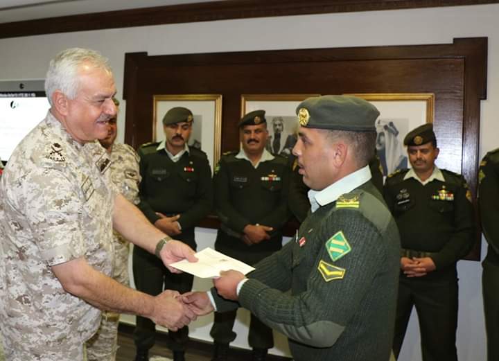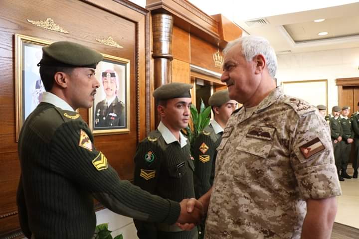 كرم رئيس هيئة الأركان المشتركة اللواء الركن يوسف أحمد الحنيطي في مكتبة بالقيادة العامة اليوم الأربعاء, مجموعة من ضباط صف وحدات حرس الحدود التابعة للمنطقة العسكرية الشمالية ممن أحبطوا عملية تهريب كمية كبيرة من المخدرات على الواجهة الشمالية خلال الأسبوع الماضي.