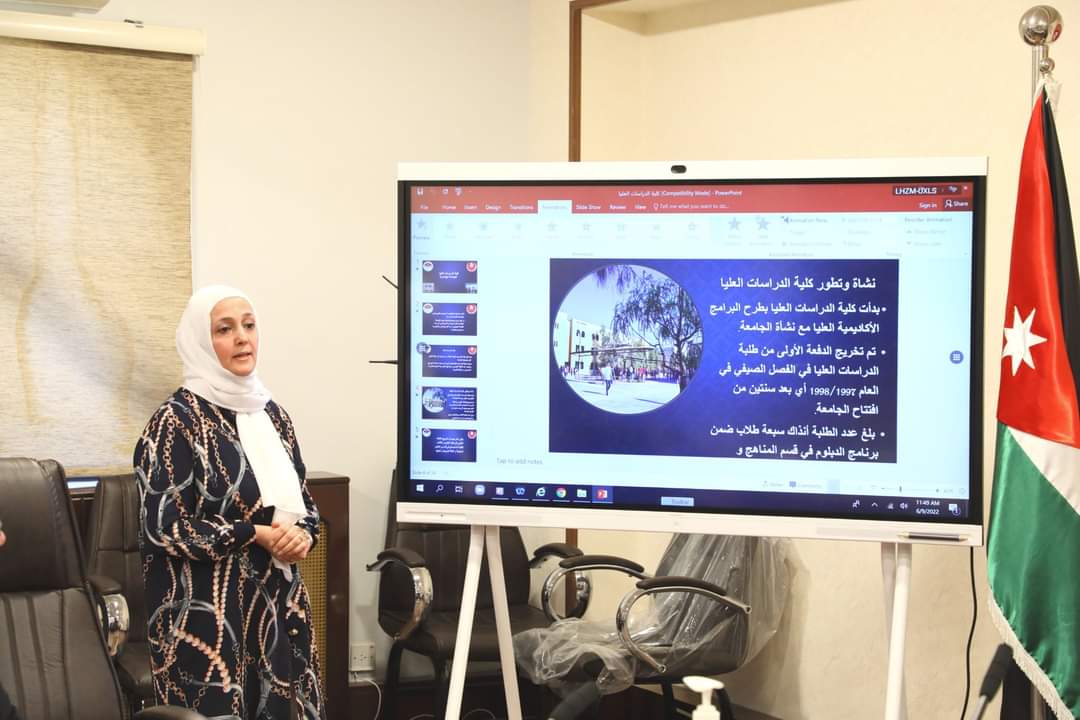 بدورها قدمت مساعدة عميد كلية الدراسات العليا الدكتوره نجاح الزعبي عرضاً تقديمياً عن برامج الدراسات العليا التي تطرحها الجامعة حيث تطرح (33) برنامجاً في الماجستير وبرنامج واحد في الدكتوراة، وبرنامج واحد لدبلوم العالي، والاختصاص العالي في الطب.