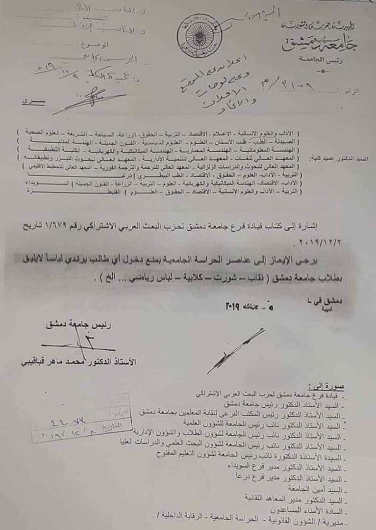 ثار جدل واسع في مواقع التواصل الاجتماعي حول قرار، قيل إنه صدر عن محمد ماهر قباقيبي، رئيس جامعة دمشق، قضى بمنع ارتداء "نقاب- شورت- كلابية- لبس رياضي" في الحرم الجامعي.