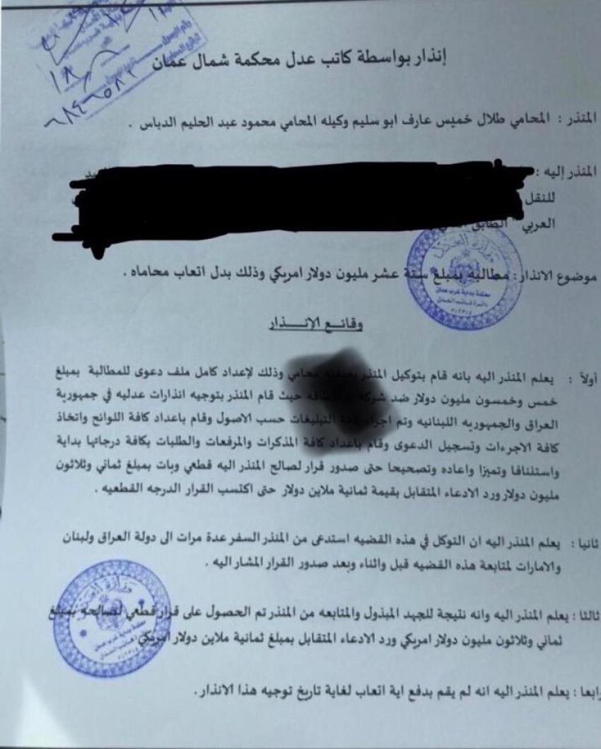 باشر المحامي طلال خميس ابوسليم إجراءات إقامة الدعاوى للمطالبة بمبلغ 16 مليون دولار بدل أتعاب محاماة عن قضية واحدة.