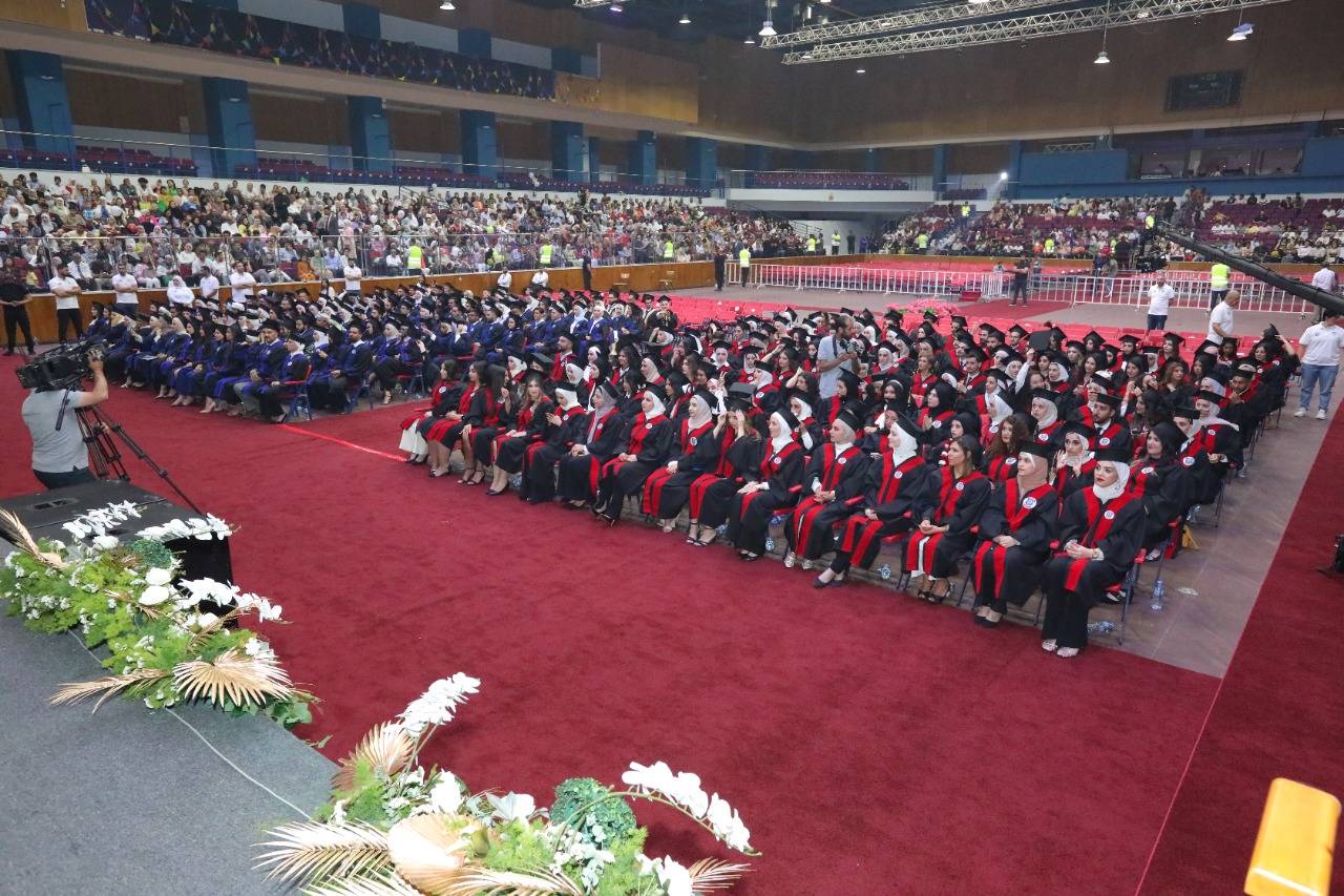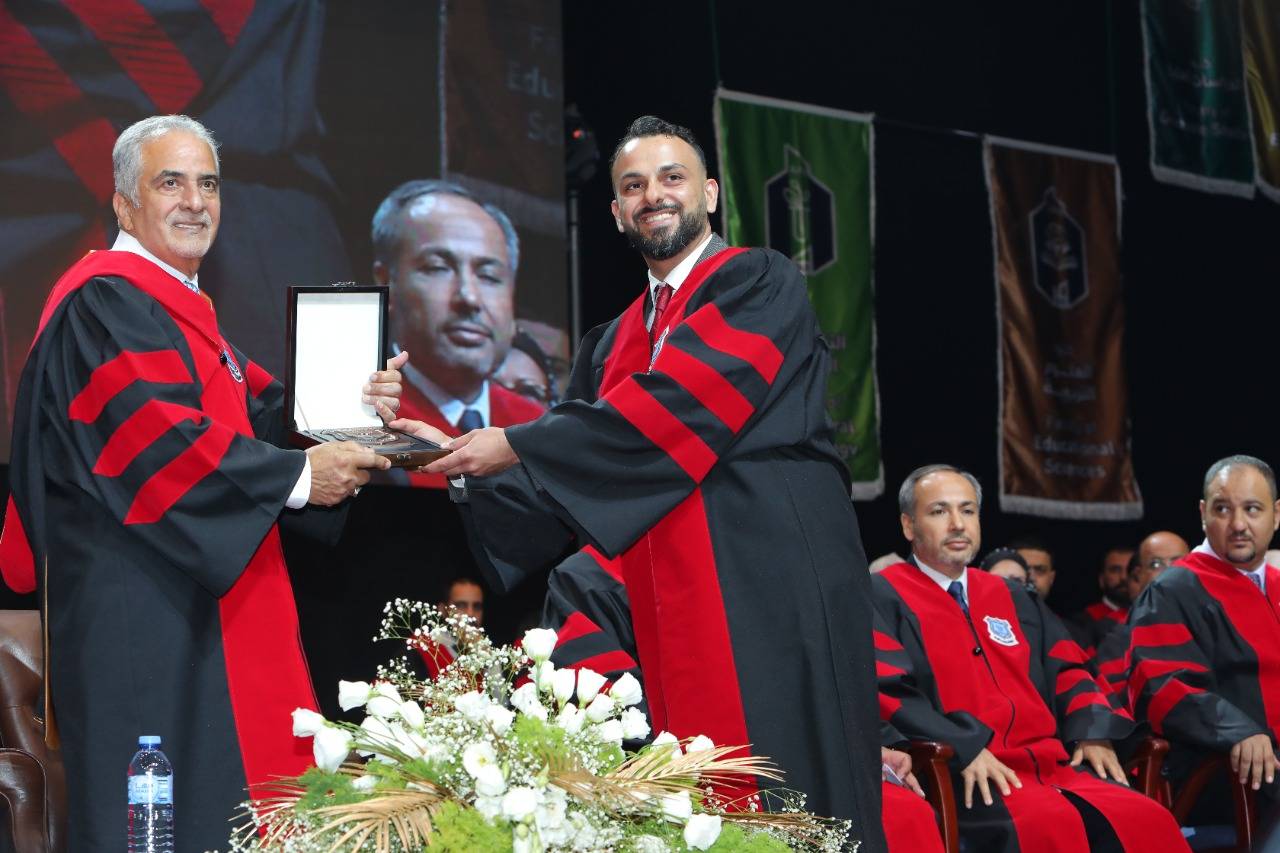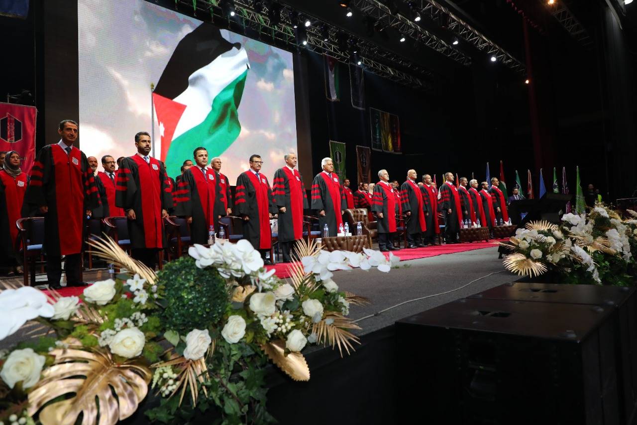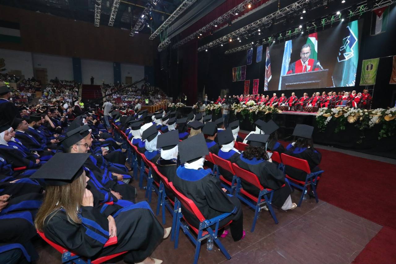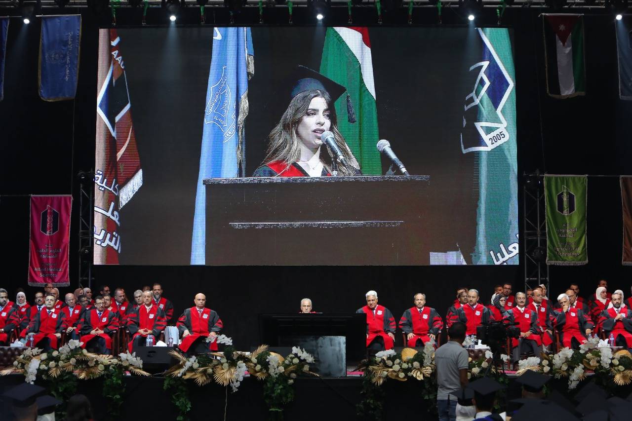 •وألقى عميد شؤون الطلبة د.مصطفى عطيات كلمة الجامعة رحب فيها بالحضور ثم قال : نعتز بأن نقدم في هذا الحفل كوكبة جديدة من خريجي كلية التميز والريادة كلية الدراسات العليا بمختلف تخصصاتها وبرامجها، وخريجي كلية الأصالة والتفوق كلية الآداب والعلوم أول الكليات تأسيساً على مستوى الجامعة، وخريجي كلية الكفاءة والابتكار كلية العلوم والتربوية أحدث كليات الجامعة من حيث التأسيس، حيث تضاف هذه الدفعة من الخريجين الى رصيد هذه المؤسسة الاكاديمية التي تؤكد التزامها بتأهيل أجيال من المتفوقين والمبدعين ليكونوا شهوداً على هذا الإنجاز الذي تقدمه الجامعة تحقيقاً للتميز الذي نسعى نحوه.