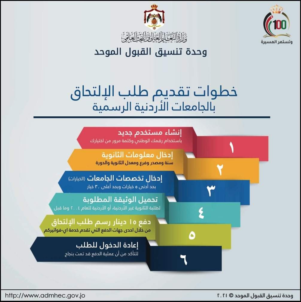 الطلبة الأعزاء التصميم أدناه يوضح خطوات بسيطة وسهلة لعملية تقديم طلب الإلتحاق بالجامعات الأردنية الرسمية التزم بها حتى يكون طلبك صحيح وتتجنب أي خطأ لا سمح الله قد يحرمك من المنافسة