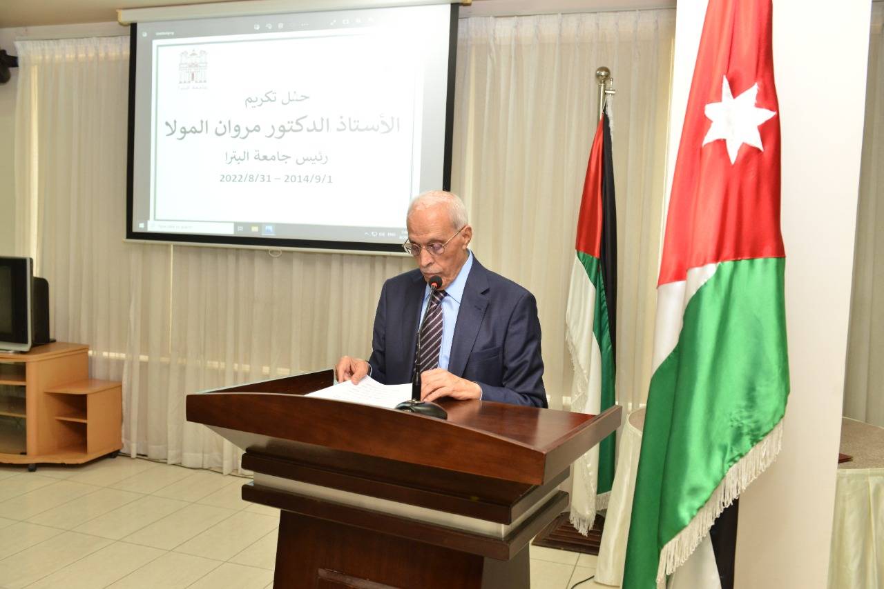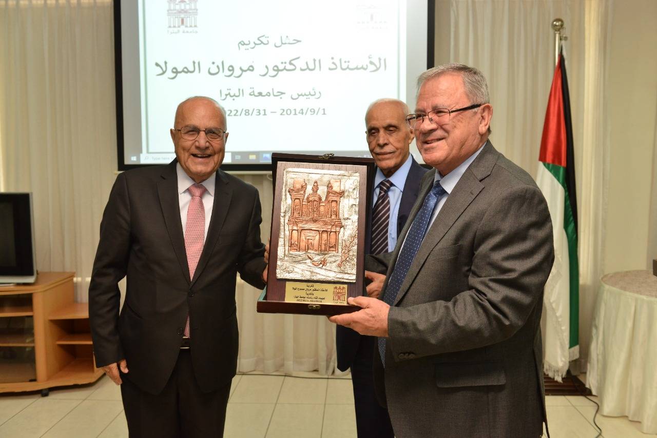 كرم رئيس مجلس أمناء جامعة البترا موسى شحادة والمستشار الأعلى للجامعة الدكتور عدنان بدران رئيس الجامعة الدكتور مروان المولا بمناسبة انتهاء عمله كرئيس لجامعة البترا، والذي عمل فيها لمدة ثماني سنوات متتالية وشارك في حفل التكريم أعضاء مجلس أمناء الجامعة ورئيس الجامعة الجديد الدكتور رامي عبد الرحيم وعمداء الكليات ونوابهم ورؤساء الأقسام الاكاديمية ومدراء الدوائر وعدد من أعضاء الهيئتين الأكاديمية والإدارية.