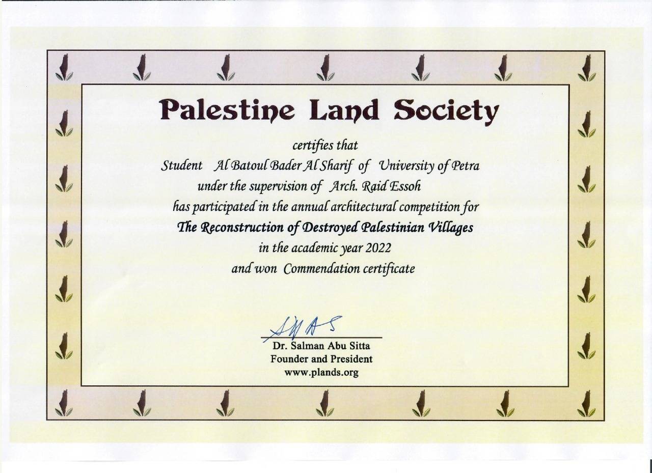 حصل قسم هندسة العمارة في جامعة البترا على "مرتبة الشرف" وجائزة تقديرية في المسابقة الدولية لإعادة إعمار القرى الفلسطينية المهدمة بدورتها السادسة لعام 2022، والتي نظمتها "هيئة أرض فلسطين" في بريطانيا.