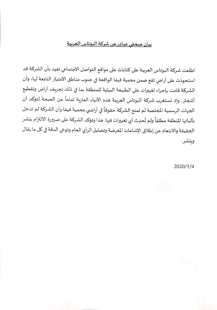 اطلعت شركة البوتاس العربية على الكتابات على مواقع التواصل الاجتماعي تفيد بأن الشركة قد استحوذت على أراض تقع ضمن محمية فيفا الواقعة في جنوب مناطق الامتياز التابعة لها ، وان الشركة قامت بإجراء تغييرات على الطبيعة البيئية للمنطقة بما في ذلك تجريف أراض وتقطيع أشجار ، وإذ تستغرب شركة البوتاس العربية هذه الأنباء العارية تماما عن الصحة لتؤكد أن الجهات الرسمية المختصة لم تمنح الشركة حقوقا في أراضي محمية فيفا وان الشركة لم تدخل بألياتها المنطقة مطلقا ولم تحدث أي تغيرات فيها ، هذا وتؤكد الشركة على ضرورة الالتزام بنشر الحقيقة والابتعاد عن إطلاق الإشاعات المغرضة وتضليل الرأي العام وتوخي الدقة في كل ما يقال وينشر.