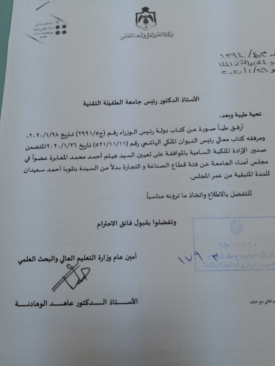 صدرت الإرادة الملكية السامية بتعيين السيد احمد محمد العمايرة عضوا في مجلس أمناء الجامعة عن قطاع الصناعة والتجارة بدلا من السيدة بنلويا احمد سعيدان عن المدة المتبقية من عمر المجلس في هذا الدورة.