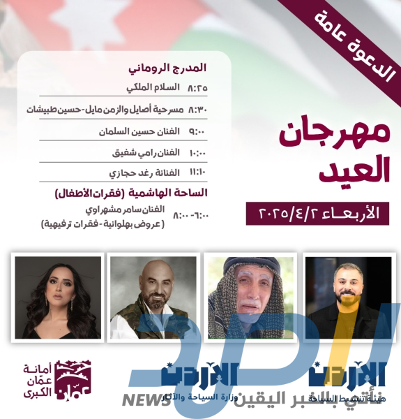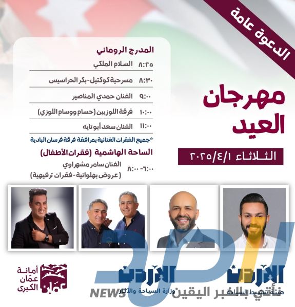 عمان – أعلنت وزارة السياحة والآثار عن تنظيم سلسلة من الفعاليات والأنشطة احتفالاً بعيد الفطر المبارك، بالتعاون مع امانة عمان والتي ستنطلق في يومي الثلاثاء والأربعاء الموافق 1 ~2 نيسان 2025، في المدرج الروماني (الساحة الهاشمية) بالعاصمة عمان.