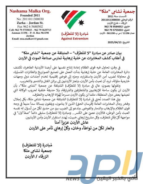 إننا في مبادرة (لا للتطرف) – المنبثقة عن جمعية نشامى ملكا – نؤكد رفضنا التام واستنكارنا الشديد لكل من تسوّل له نفسه المساس بأمن الأردن واستقراره، كما نؤكد على دعمنا الكامل للأجهزة الأمنية، وعلى رأسها دائرة المخابرات العامة، في جهودها البطولية لمواجهة المتطرفين والإرهابيين والمتآمرين، وكل خلية وفئة تحاول جر الأردن ليكون بؤرة للحروب بالوكالة.