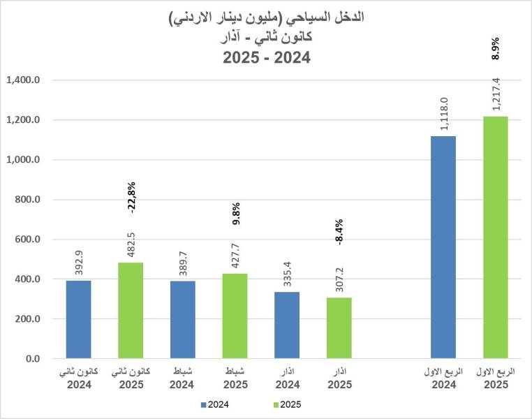 بلغ الدخل السياحي خلال الربع الأول من هذا العام 1,217.4 مليون دينار أردني وبارتفاع 8.9% مقارنة مع العام الماضي.