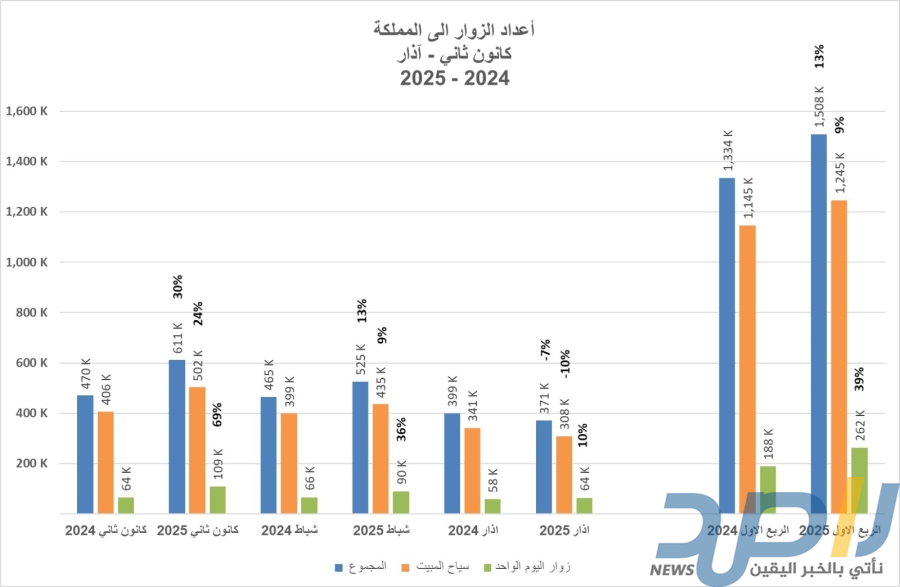 بلغ عدد الزوار خلال الربع الأول من هذا العام 1,507,546 زائرًا وبارتفاع 13.0% مقارنة مع العام الماضي.