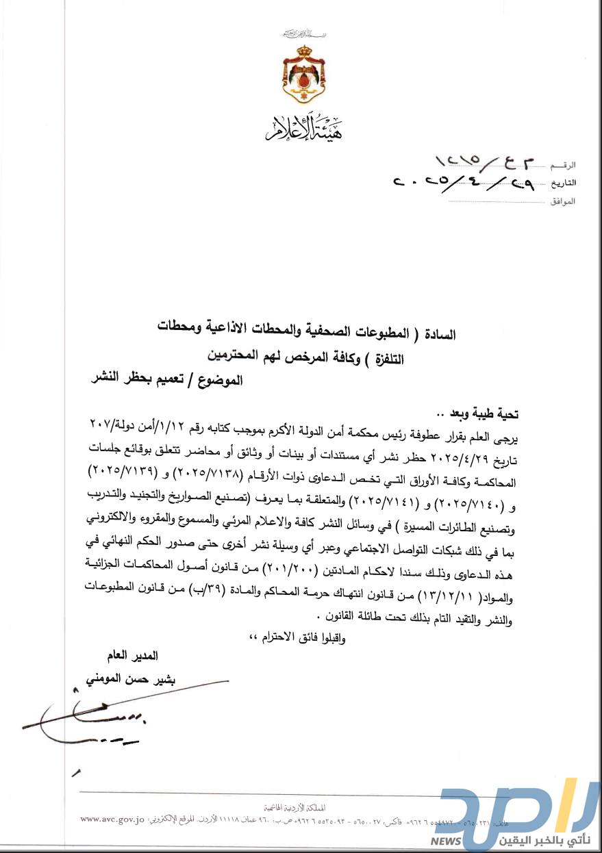 أصدر رئيس محكمة أمن الدولة خطاباً رسمياً وجه لهيئة الاعلام، ليصار الى تعميمه حمل فيه الحظر النشر لاي مواد متعلقة بوقائع محاكمات قضايا تُعنى بتصنيع الصواريخ، والتجنيد، والتدريب، وتصنيع الطائرات المسيرة، وذلك في كافة وسائل الإعلام المرئية والمسموعة والمقروءة والإلكترونية، بما فيها منصات التواصل الاجتماعي.