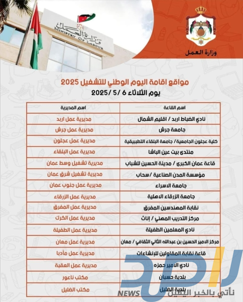 أكد الناطق الإعلامي لوزارة العمل محمد الزيود أن نحو 500 شركة من مؤسسات القطاع الخاص أكدت مشاركتها في اليوم الوطني للتشغيل الذي تنظمه الوزارة في العاصمة وكافة محافظة المملكة يوم الثلاثاء الموافق 2025/5/6، من الساعة 10 صباحا-3:30 عصرا.