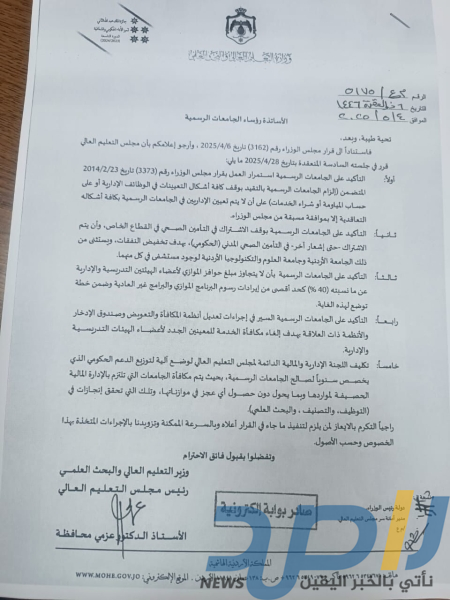 وجه رئيس الوزراء في كتابه الى مجلس التعليم العالي الى وقف التأمين الصحي في القطاع الخاص وعدم زياده نسبه مكافأه الموازي عن ٤٠٪ ما يخصص للهيئتين الاداريه والاكاديميه وتعديل انظمه المكافأت وصناديق الجامعات للجامعات والمؤسسات البحثية فيها ، مما يشكل استبعادا لكافه مميزات العمل الاكاديمي في الاردن وتجريدا لهم من كل حقوقهم التي يمكن ان تشكل حافزا لمنتسبي الجامعات الرسميه وبالنتيجة اعتداء على حريه العمل الاكاديمي التي كفلها الدستور الاردني ومساسا بمبدأ المساواه وصولا الى المس بالسلم الاجتماعي والاقتصادي الذين كفلهما الدستور الاردني .