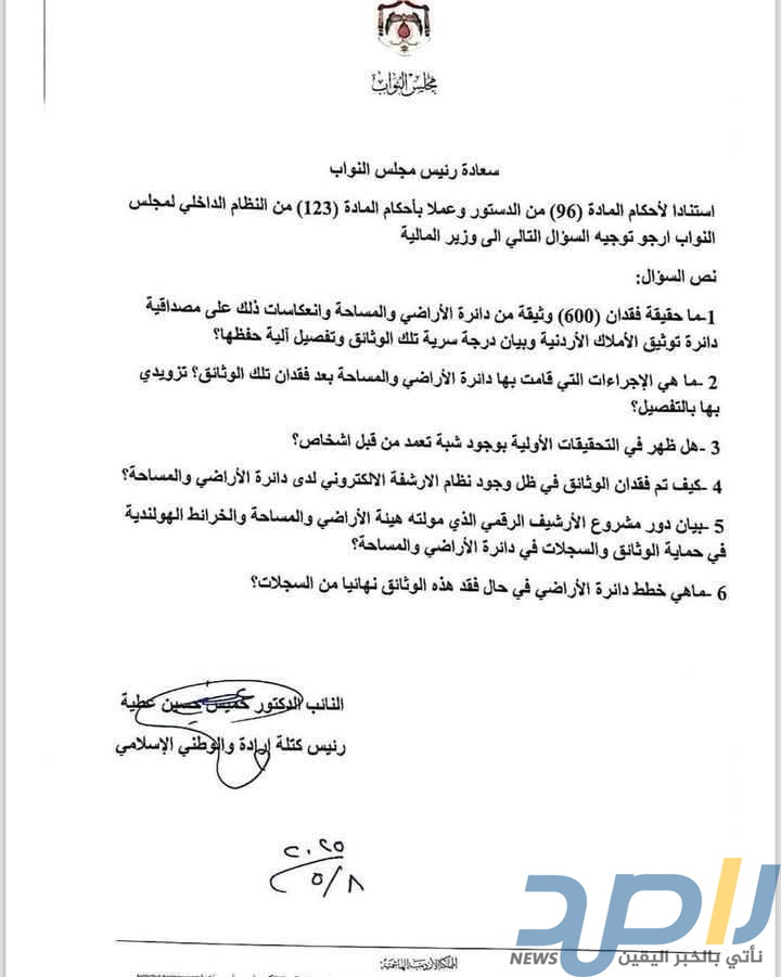 عمان — تقدّم النائب الدكتور خميس عطية، رئيس كتلة إرادة والوطني الإسلامي، بسؤال نيابي عاجل إلى وزير المالية بخصوص فقدان 600 وثيقة من سجلات دائرة الأراضي والمساحة، مشدداً على ضرورة كشف الملابسات وضمان الشفافية.