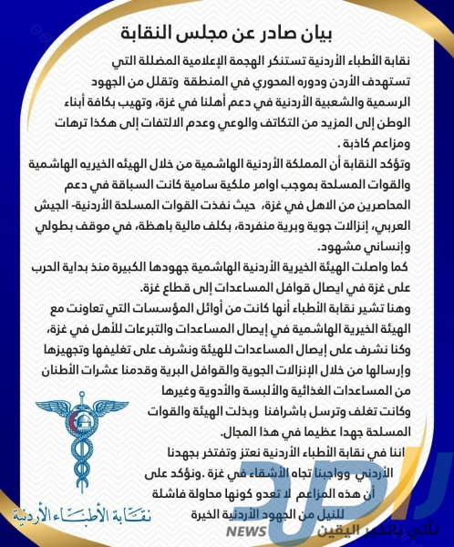 اننا في نقابة الأطباء الأردنية نعتز وتفتخر بجهدنا الأردني وواجبنا تجاه الأشقاء في غزة .ونؤكد على أن هذه المزاعم لا تعدو كونها محاولة فاشلة للنيل من الجهود الأردنية الخيرة