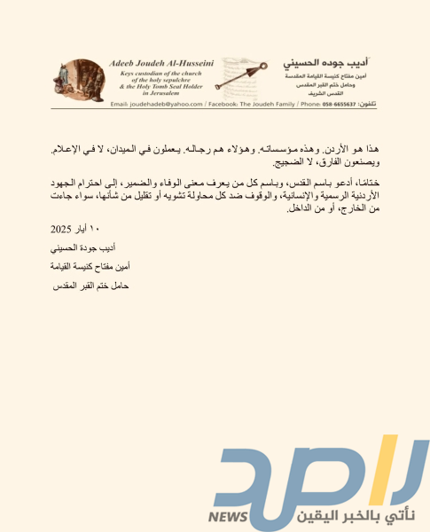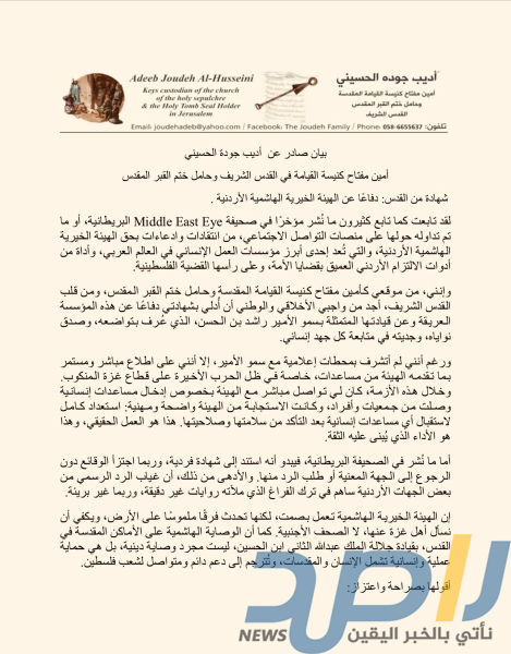 أصدر السيد أديب جودة الحسيني، أمين مفتاح كنيسة القيامة في القدس الشريف وحامل ختم القبر المقدس، بيانًا قويًا دافع فيه عن الهيئة الخيرية الهاشمية الأردنية، رافضًا ما وصفه بـ"الادعاءات غير الدقيقة" التي نشرتها صحيفة Middle East Eye البريطانية وتداولتها منصات التواصل الاجتماعي.