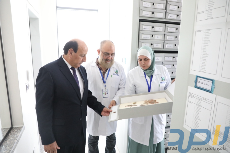 تفقد عطوفة مدير عام المركز الوطني للبحوث الزراعية الدكتور ابراهيم محمد الرواشدة سير العمل في بنك البذور الوطني حيث اطلع على اقسام بنك البذور المختلفة، مختبر إستقبال وتحضيرالعينات ،مختبر الانبات فسيولوجيا النبات ، مختبر صحة البذور ، مختبر تجهيز وتنظيف البذور ،مختبر تحضير البيئات ، مختبر DNA، المعشب النباتي ، مختبر حفظ فائق الامد (الحفظ بالسائل النيتروجيني) ، غرف تجفيف البذور ، غرفة الحفظ طويل وقصير الأمد ، حقل توصيف واكثار لمدخلات بنك البذور.