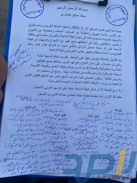 في مساء هذا اليوم السبت الموافق 17/5/2025، توجهت الجاهه الكريمه والمكونه من اصحاب السعاده والعطوفه من الشيوخ والوجهاء المدونه اسمائهم ادناه برئاسة الشيخ عبدالكريم الحويان الى ديوان قبيله الدعجه والجربان خاصه في منطقه ام قصير والمقابلين وكان في استقبالهم جمع غفير من الشيوخ والوجهاء من قبيله الدعجه وفي مقدمتهم الشيخ رافع الغرير الدعجة على اثر حادثه مصلى الرواق والذي تسبب به المدعو فواز بشار سعيد الطباع من ادعاءات باطله وتشهير بعشيره الجربان وقبيله الدعجه .