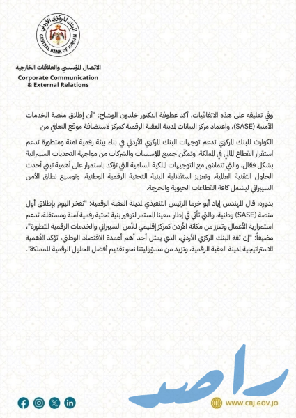و من جانبه، صرّح المهندس إياد أبو خرما، الرئيس التنفيذي لمدينة العقبة الرقمية: "نفخر بثقة البنك المركزي، التي تُكرّس دورنا كشريك استراتيجي في التحول الرقمي. المنصة الجديدة ستوفر بنية تحتية آمنة تدعم استقلالية القطاع المالي وتجعل الأردن وجهةً رائدة في مجال الأمن السيبراني".