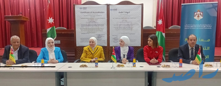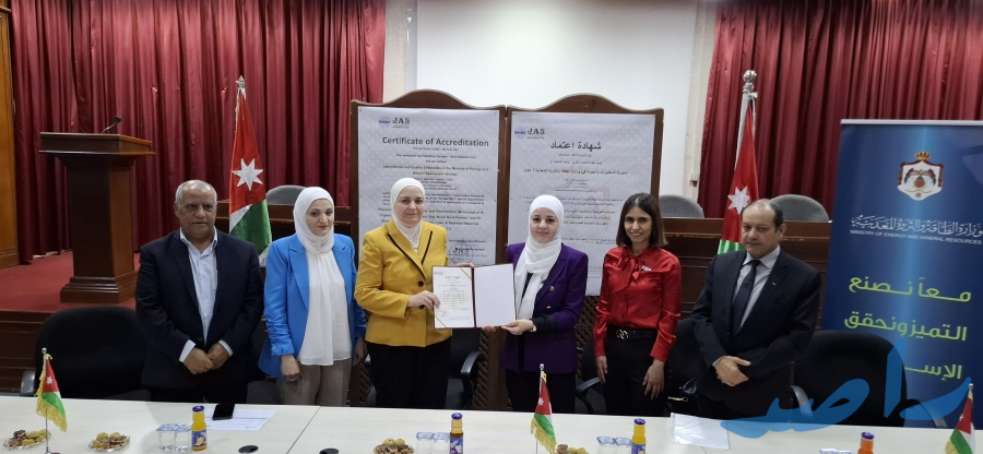 وجرى تسليم شهادة الاعتماد خلال حفل رسمي برعاية أمين عام وزارة الطاقة والثروة المعدنية المهندسة أماني العزام جمع مدير وحدة الاعتماد والتقييس في مؤسسة المواصفات والمقاييس الأردنية المهندسة لانا المراشدة، ومديرة مديرية المختبرات في الوزارة المهندسة ميسون الخزاعي وكادر المديرية، إلى جانب مدراء مديرية الجيولوجيا والتعدين هشام الزيود ومدير مديرية البترول والصخر الزيتي بهجت العدوان.