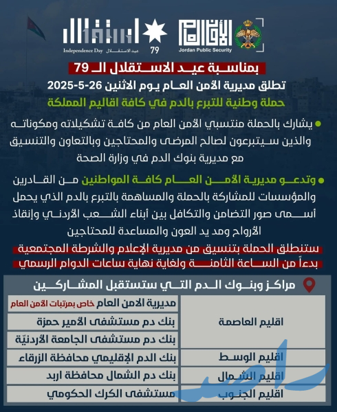 عمّان – تطلق مديرية الأمن العام يوم غدٍ الاثنين الموافق 26 أيار 2025 حملة وطنية للتبرع بالدم في كافة أقاليم المملكة، وذلك بمناسبة الذكرى التاسعة والسبعين لاستقلال المملكة الأردنية الهاشمية.