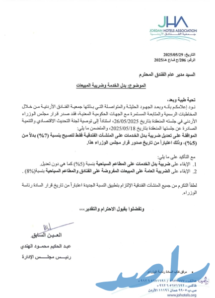 و من ناحية عملية، أفاد البيان بأن جمعية الفنادق الأردنية قد باشرت إجراءاتها، ووجهت الخطابات الرسمية إلى كافة إدارات الفنادق الأردنية الأعضاء لتعليمهم بسريان قرار رفع ضريبة الخدمة، مُوضحةً أن القرار نافذ المفعول اعتبارًا من تاريخ صدوره في 26 من الشهر الجاري (مايو 2025).
