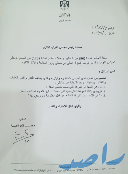 وجَّه النائب محمد قاسم المراعية الحويطات، مساعد رئيس مجلس النواب، استجواباً رسمياً إلى معالي وزير السياحة والآثار، بشأن الحفل الذي أُقيم مؤخراً في منطقة وادي رم (والبتراء)، واصفاً إياه بـ"المخالف للدين والقيم والعادات والتقاليد الأردنية".