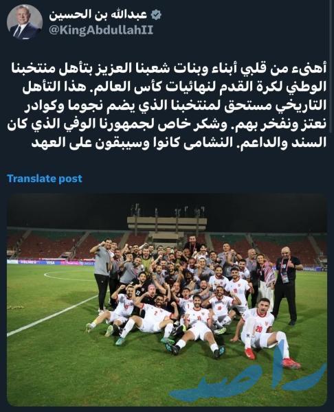 "أهنىء من قلبي أبناء وبنات شعبنا العزيز بتأهل منتخبنا الوطني لكرة القدم لنهائيات كأس العالم. هذا التأهل التاريخي مستحق لمنتخبنا الذي يضم نجوما وكوادر نعتز ونفخر بهم. وشكر خاص لجمهورنا الوفي الذي كان السند والداعم. النشامى كانوا وسيبقون على العهد"