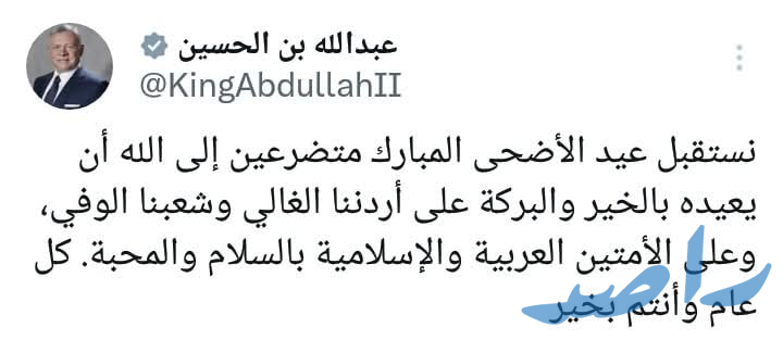 اطلق جلالة الملك عبدالله الثاني تغريدة عبر منصة إكس بمناسبة حلول عيد الأضحى المبارك