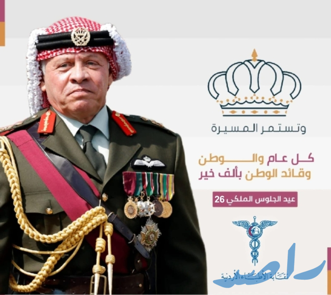 بمناسبة الذكرى السنوية لعيد الجلوس الملكي، يتقدم نقيب الاطباء واعضاء مجلس نقابة الأطباء الأردنية وهيئتها العامة، بأصدق آيات التهاني والتبريكات إلى مقام حضرة صاحب الجلالة الهاشمية الملك عبدالله الثاني ابن الحسين المعظم، حفظه الله ورعاه، وإلى سمو ولي عهده الأمين، الأمير الحسين بن عبدالله الثاني، والأسرة الهاشمية، وإلى أبناء وبنات الشعب الأردني الوفي.