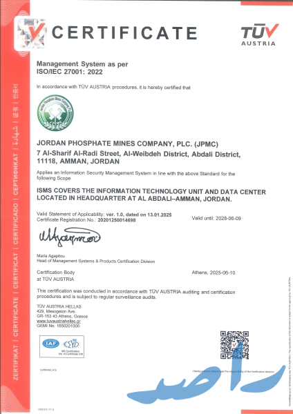 حصلت دائرة تكنولوجيا المعلومات في شركة مناجم الفوسفات الأردنية على شهادة ISO/IEC 27001:2022 المعتمدة عالميا في نظام إدارة أمن المعلومات (ISMS)، والتي تمنحها شركة (TÜV Austria).