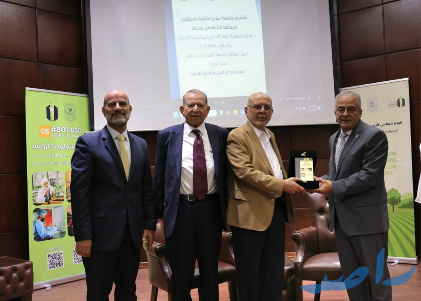 نظّمت كلية التكنولوجيا الزراعية في جامعة عمّان الأهلية، بالتعاون مع الجمعية الأردنية لمكافحة التصحر وتنمية البادية، يوماً علمياً مميزاً بمناسبة اليوم العالمي لمكافحة التصحر والجفاف لعام 2025، بحضور نخبة من أصحاب المعالي والخبراء، وممثلين عن عدد من الجهات الحكومية ومؤسسات المجتمع المحلي الرسمية والخاصة.