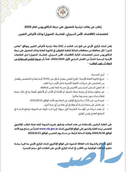 أعلن البنك المركزي الأردني عن فتح باب التقدم لـ 24 بعثة دراسية لأغراض التعيين، بواقع بعثتين لكل محافظة من محافظات المملكة، وذلك للطلبة المتفوقين في الثانوية العامة الراغبين في الحصول على درجة البكالوريوس في تخصصات الاقتصاد، الأمن السيبراني، المحاسبة، والتمويل. ستكون الدراسة في الجامعات الأردنية الرسمية اعتباراً من الفصل الدراسي الأول للعام 2026/2025.