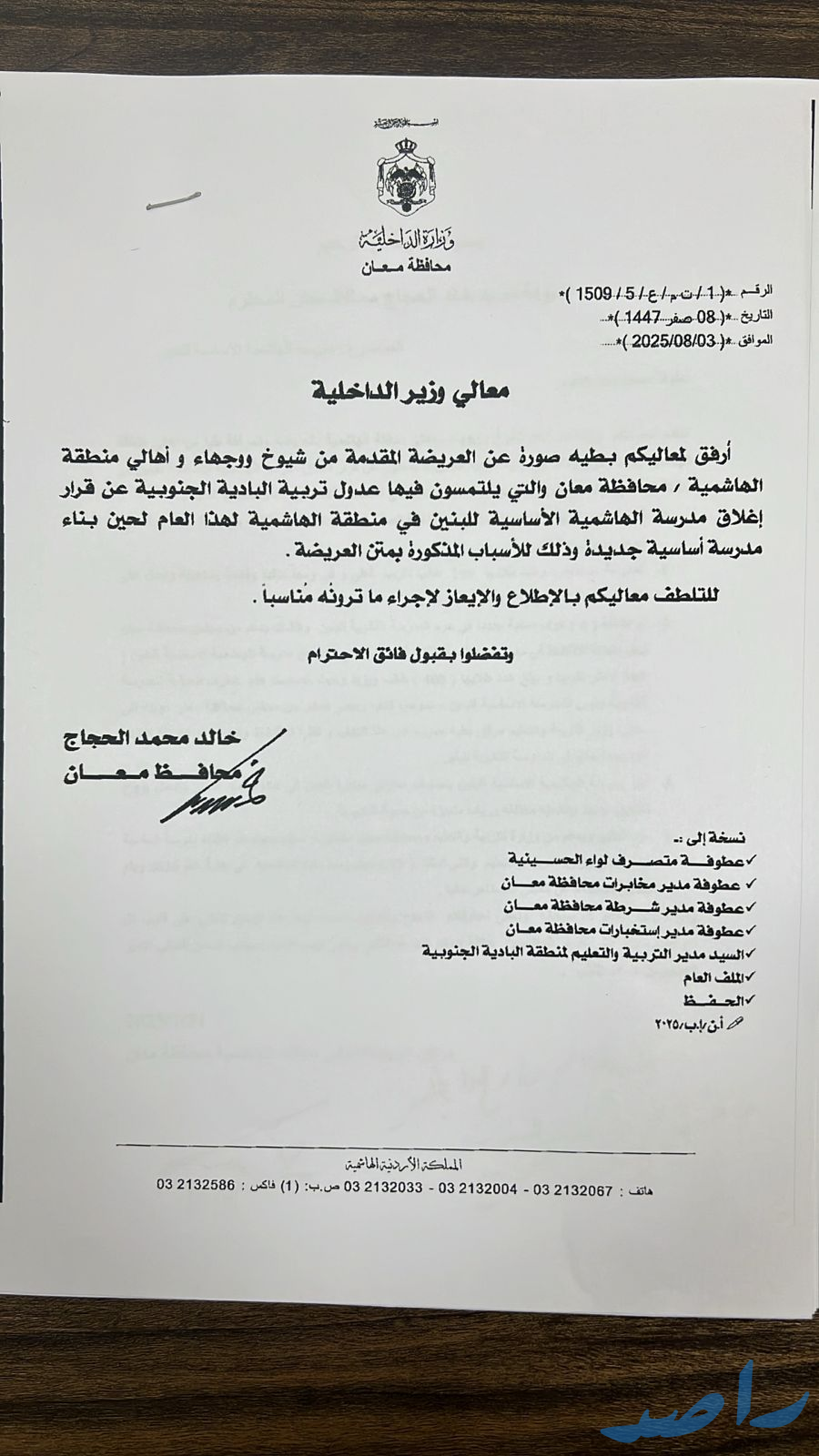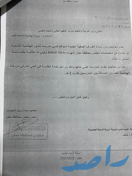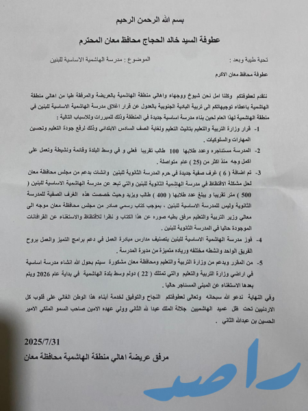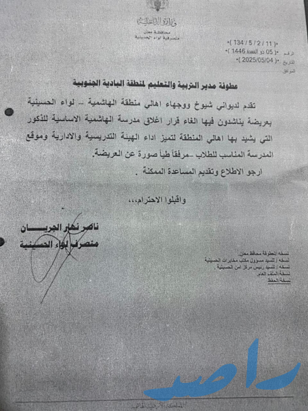 الاحد - ٢٠٢٥/٨/١٠ - تقدم أهالي منطقة الهاشمية التابعة لمحافظة معان بعريضة إلى محافظ معان، طالبوا فيها بعدم إغلاق مدرسة الهاشمية الأساسية للبنين لهذا العام، لحين بناء مدرسة جديدة في المنطقة. وجاء في العريضة، المرفقة بتوقيعات شيوخ ووجهاء المنطقة، أن القرار سيؤثر سلباً على العملية التعليمية لأبنائهم، خاصة أن المدرسة المستأجرة تضم نحو 100 طالب وتعمل بكفاءة منذ أكثر من 25 عاماً.