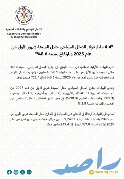 من جهة أخرى، ارتفع إنفاق الأردنيين على السياحة الخارجية خلال الفترة ذاتها بنسبة 4.0% ليصل إلى ملياراً و247 مليون دولار، مع تسجيل شهر تموز وحده زيادة بواقع 7.0% حيث بلغ الإنفاق الخارجي 247.4 مليون دولار. تعكس هذه الأرقام استمرار ديناميكية القطاع السياحي كأحد الركائز الأساسية للاقتصاد الوطني.