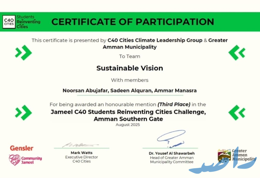 •فريق "Sustainable Vision" المكوَّن من الطلبة: نورسان أبو جعفر، سدين القرعان، عمار المناصرة (من طلبة ماجستير المدن المستدامة الذكية بجامعة البترا) بالمركز الثالث، بإشراف الدكتور عمرو ياغي.
