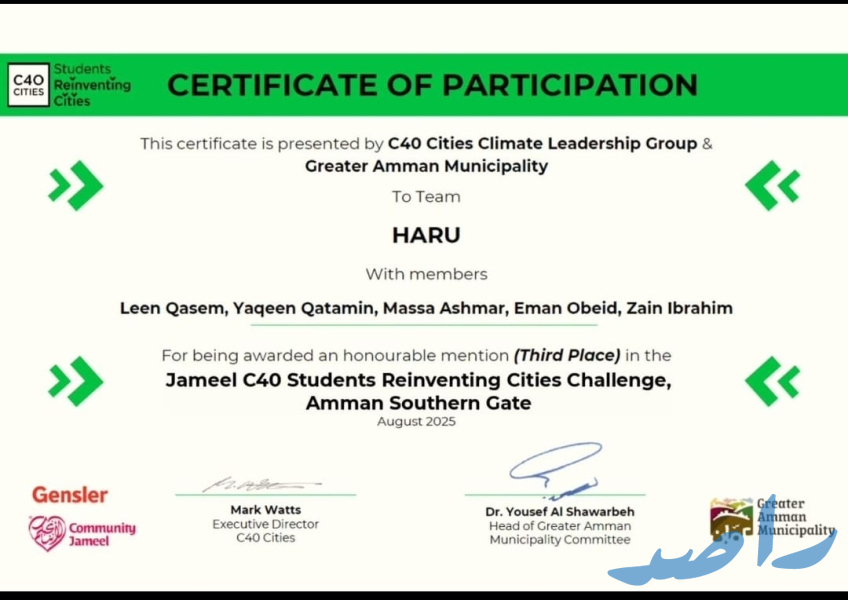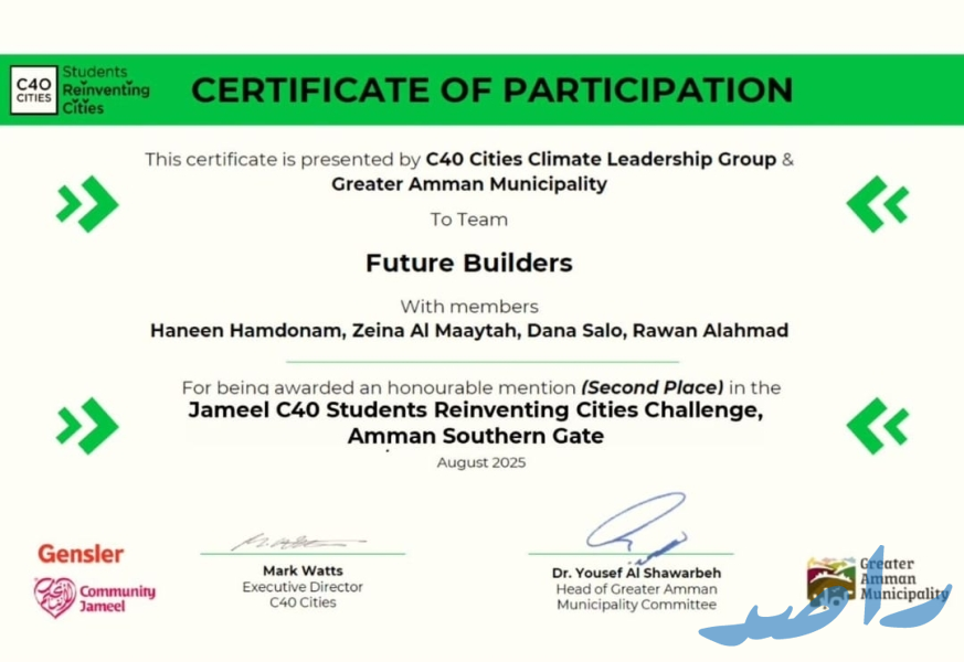 •فريق "Future Builders" المكوَّن من الطالبات: حنين حمدونة، زينة المعايطة، دانة سلو، روان الأحمد (من طلبة السنة الرابعة في هندسة العمارة بجامعة البترا) بالمركز الثاني، بإشراف الدكتورة هدير مرزه والمهندسة شذى قطيط.