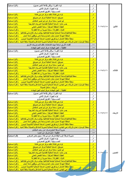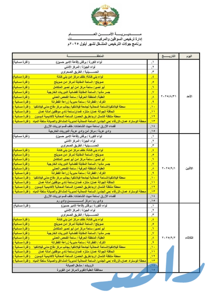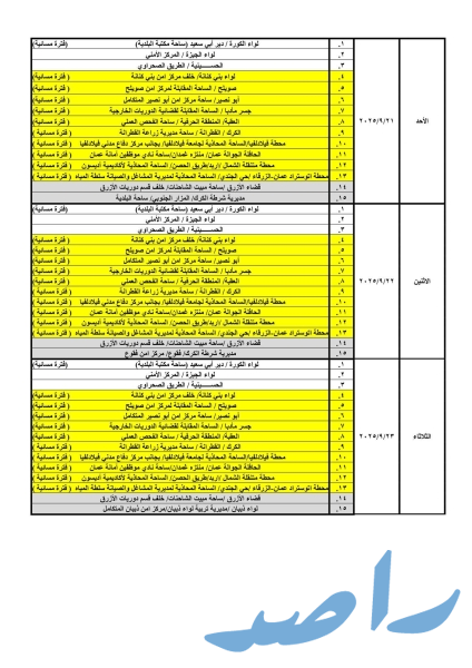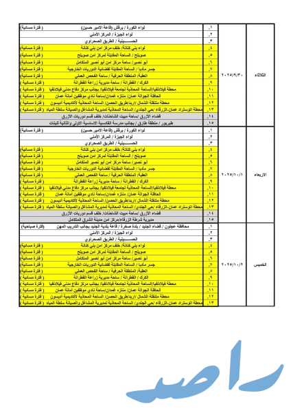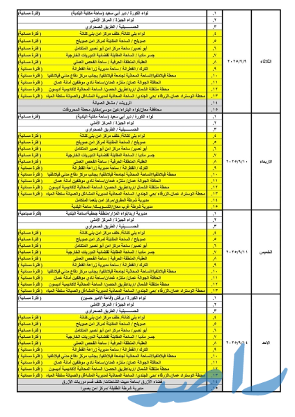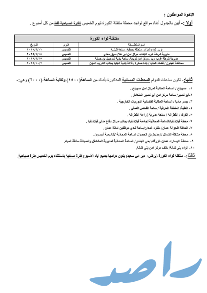 حيث ستكون ساعات الدوام الصباحي من يوم الأحد ولغاية يوم الأربعاء من الساعة 8:00 صباحًا وحتى الساعة 2:00 ظهرًا، ويوم الخميس من الساعة 8:00 صباحًا ولغاية الساعة 1:00 ظهرًا ودوام المحطات المسائية من الساعة 3:00 عصراً حتى الساعة 8:00 مساءً.