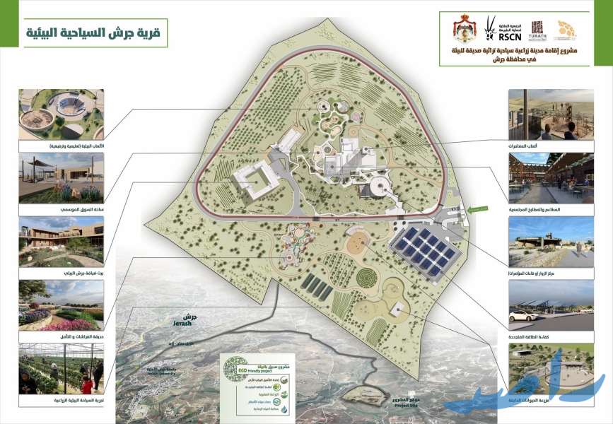 مشروع القرية السياحية البيئية في جرش يوفر بيئة سياحية فريدة ومتكاملة، ويشمل إنشاء حديقة بيئية متكاملة المرافق تعتمد أنظمة بيئية حديثة ومستدامة تعكس هوية المنطقة وطبيعتها، وفندقاً رفيقاً للبيئة، وقاعة مؤتمرات، ومرافق للعائلات والأطفال، وأماكن للألعاب وأنشطة المغامرات ويوفِّر مساحة لعرض وتسويق المنتجات المحلية.