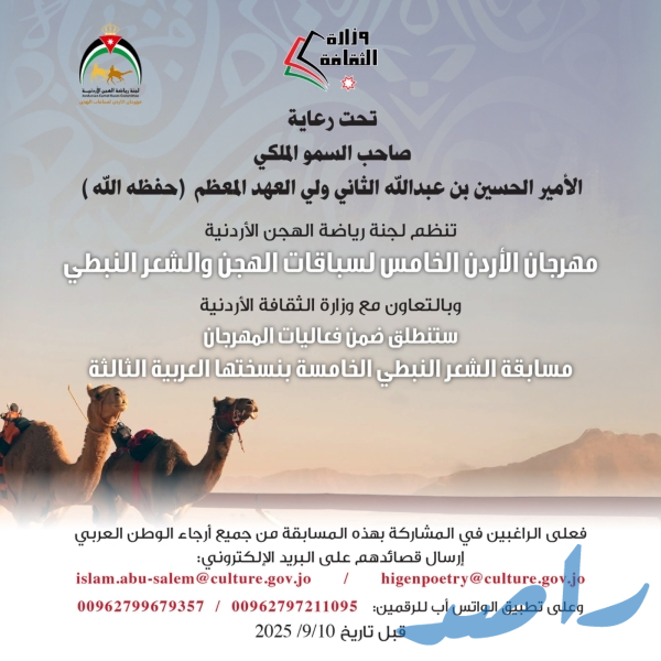 تحت رعاية صاحب السمو الملكي الأمير الحسين بن عبد الله الثاني، ولي العهد المعظم (حفظه الله ) تنظم لجنة رياضة الهجن الأردنية مهرجان الأردن الخامس لسباقات الهجن والشعر النبطي، وبالتعاون مع وزارة الثقافة الأردنية ستنطلق ضمن فعاليات المهرجان مسابقة الشعر النبطي الخامسة بنسختها العربية الثالثة.
