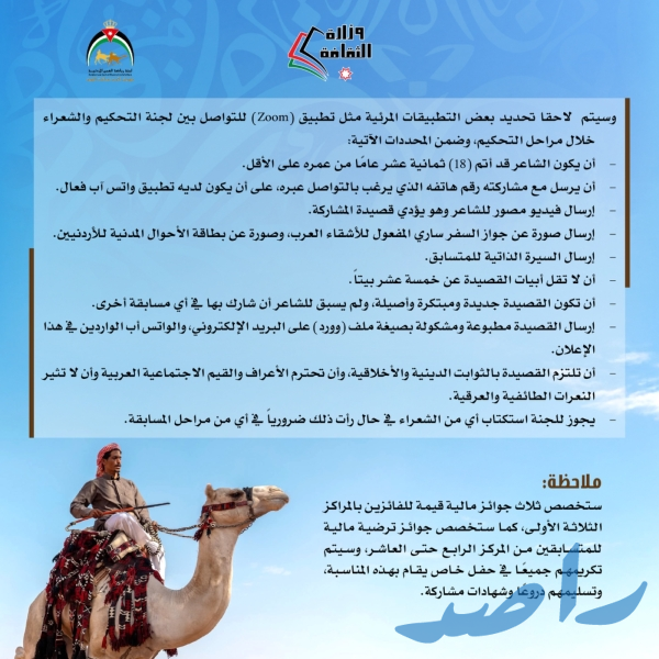 وسيتم لاحقا تحديد بعض التطبيقات المرئية مثل تطبيق (زووم) للتواصل بين لجنة التحكيم والشعراء خلال مراحل التحكيم، وضمن المحددات الآتية:
