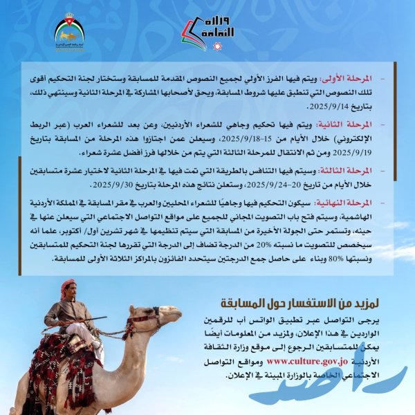 المرحلة الثانية ويتم فيها تحكيم وجاهي للشعراء الأردنيين، وعن بعد للشعراء العرب (عبر الربط الإلكتروني) خلال الأيام من 15-18/9/2025 ، وسيعلن عمن اجتازوا هذه المرحلة من المسابقة بتاريخ 19/9/2025 ومن ثم الانتقال للمرحلة الثالثة التي يتم من خلالها فرز أفضل عشرة شعراء.