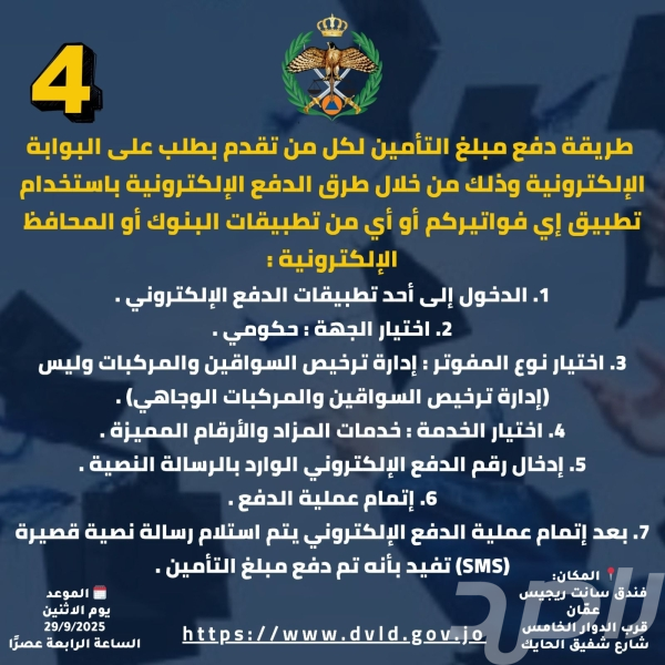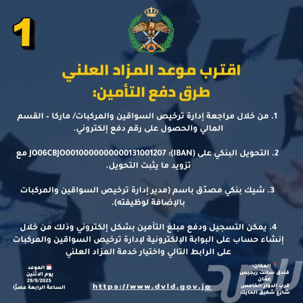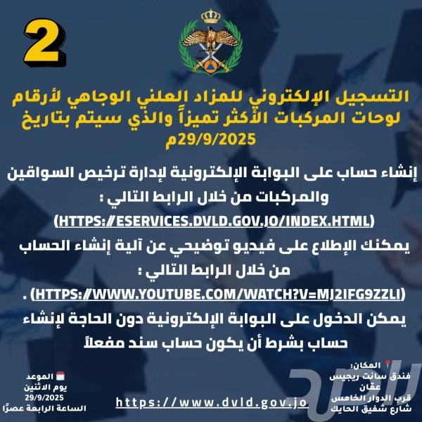 اعلن الناطق الاعلامي باسم مديريه الامن العام الاردنيه والشروط الواجب توافرها في من يريد المشاركه في هذا المزاد وبان خطوات التسجيل عبر البوابة الإلكترونية لإدارة الترخيص للراغبين بالمشاركة بالمزاد العلني.