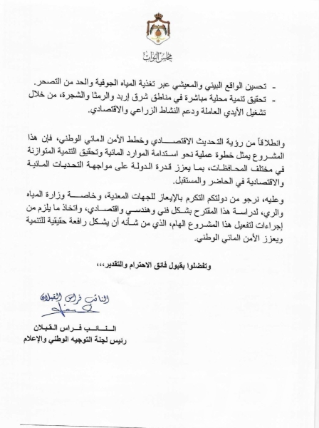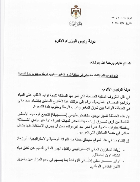 قدّم النائب فراس القبلان، رئيس لجنة التوجيه الوطني والإعلام في مجلس النواب، مقترحًا إلى دولة رئيس الوزراء لإنشاء سد مائي في منطقة شرق المغير – غرب الرمثا – جنوب بلدة الشجرة، وذلك في ظل التحديات المائية التي تواجهها المملكة نتيجة ازدياد الطلب على المياه وتراجع المصادر الطبيعية.