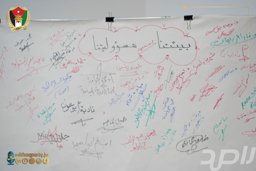 وفي ختام الفعالية تم التوقيع على جدارية اعتُبرت وثيقة شرف، تعبيراً عن إيمان الحزب العميق بأهمية المحافظة على البيئة الأردنية،ض والتزام جميع أعضائه بالبدء بأنفسهم لتجسيد هذا الميثاق البيئي في الممارسة اليومية والعمل الوطني.