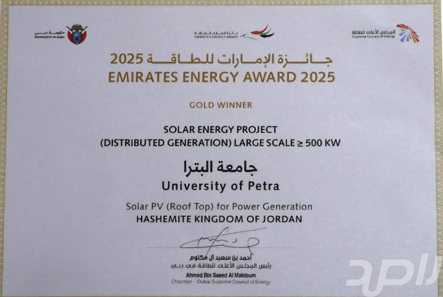 جامعة البترا تحصد المركز الأول والمستوى الذهبي في جائزة الامارات للطاقة