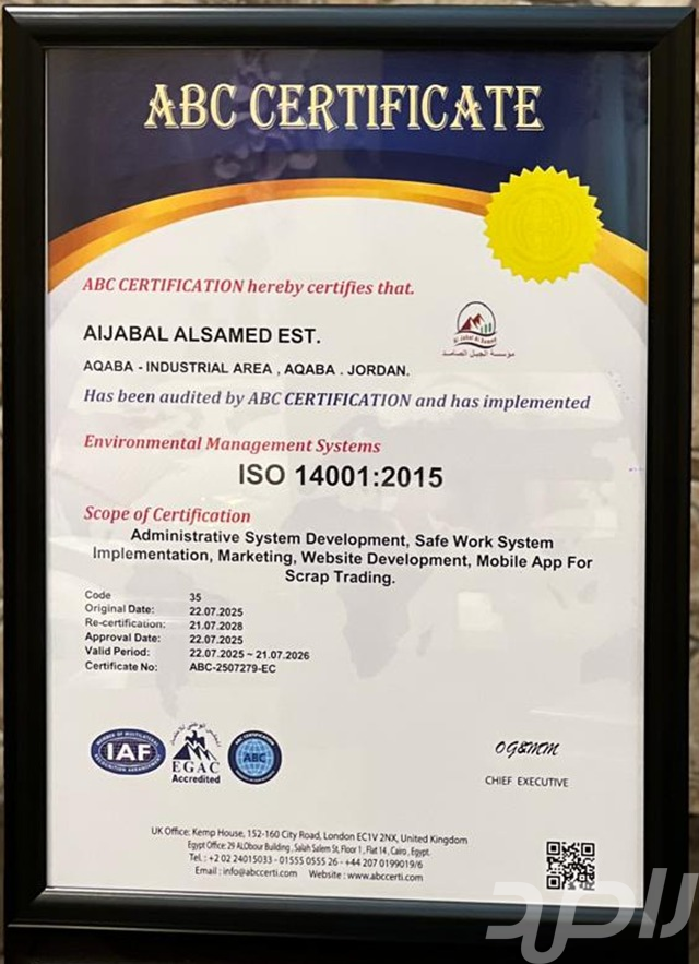 في إنجاز نوعي وغير مسبوق في قطاع هدم المصانع الكبرى والاتجار بالسكراب، نجحت مؤسسة الجبل الصامد في الحصول على شهادتي ISO 45001 للصحة والسلامة المهنية، وISO 14001 لنظام الإدارة البيئية، لتكون بذلك أول مؤسسة في قطاعها في الأردن والمنطقة تحصد هذا التميز العالمي.
