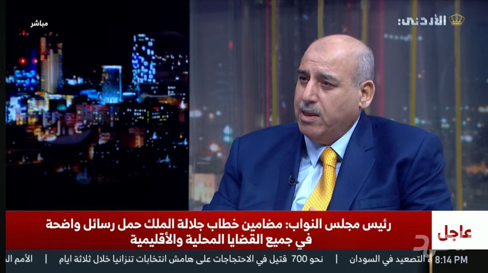 رئيس مجلس النواب: حديثي يؤكد على وحدتنا الوطنية والمسؤولية بأن تكون بوصلتنا نحو الأردن أرضًا وسيادة